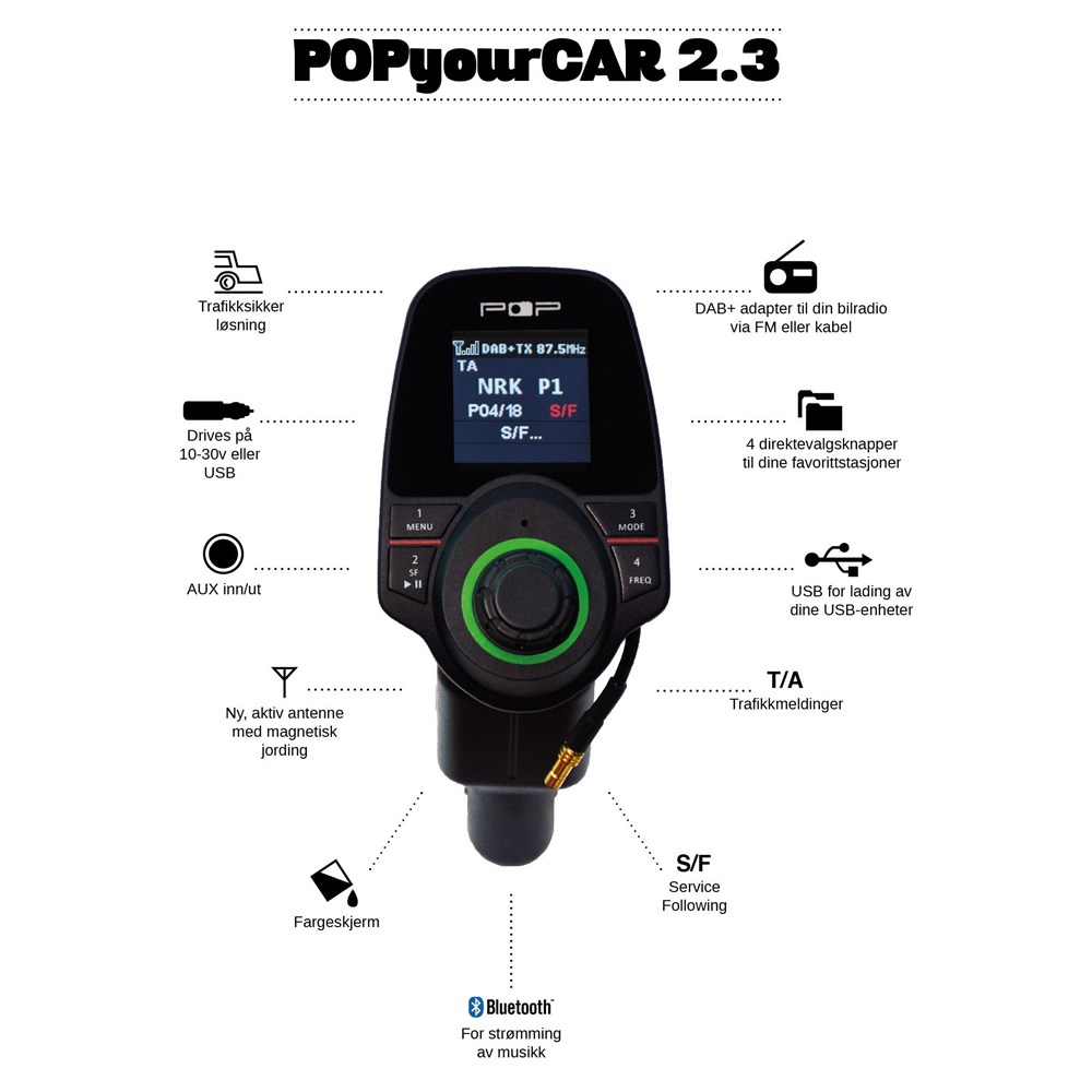 POPyourCAR 2.3 DAB+ Biladapter med DAB+ Bluetooth og AUX